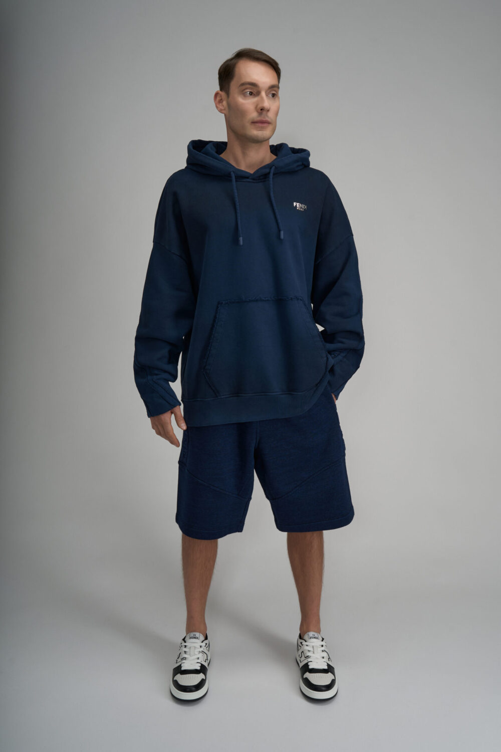 • Seamless and small “Fendi Roma” lettering in metal with a palladium-effect finish on the chest
